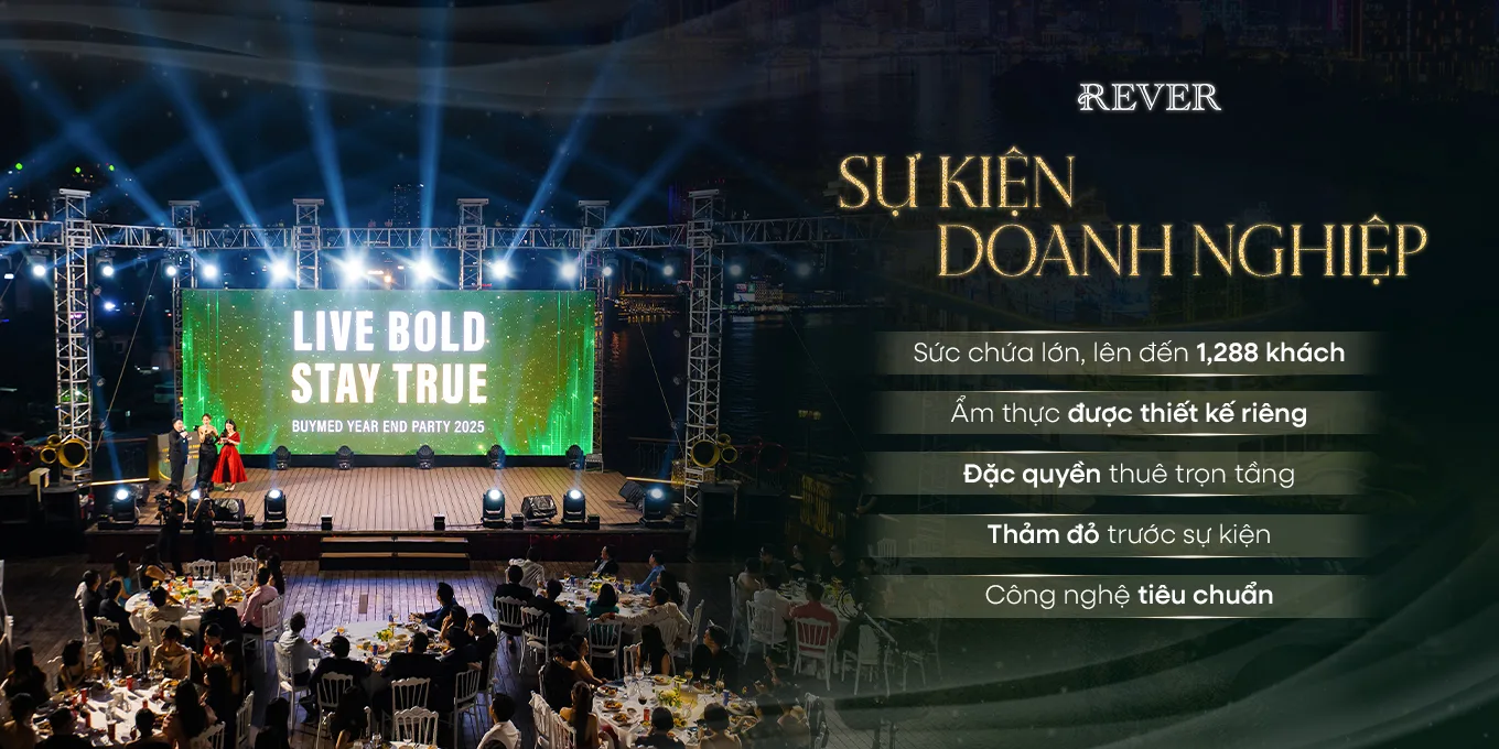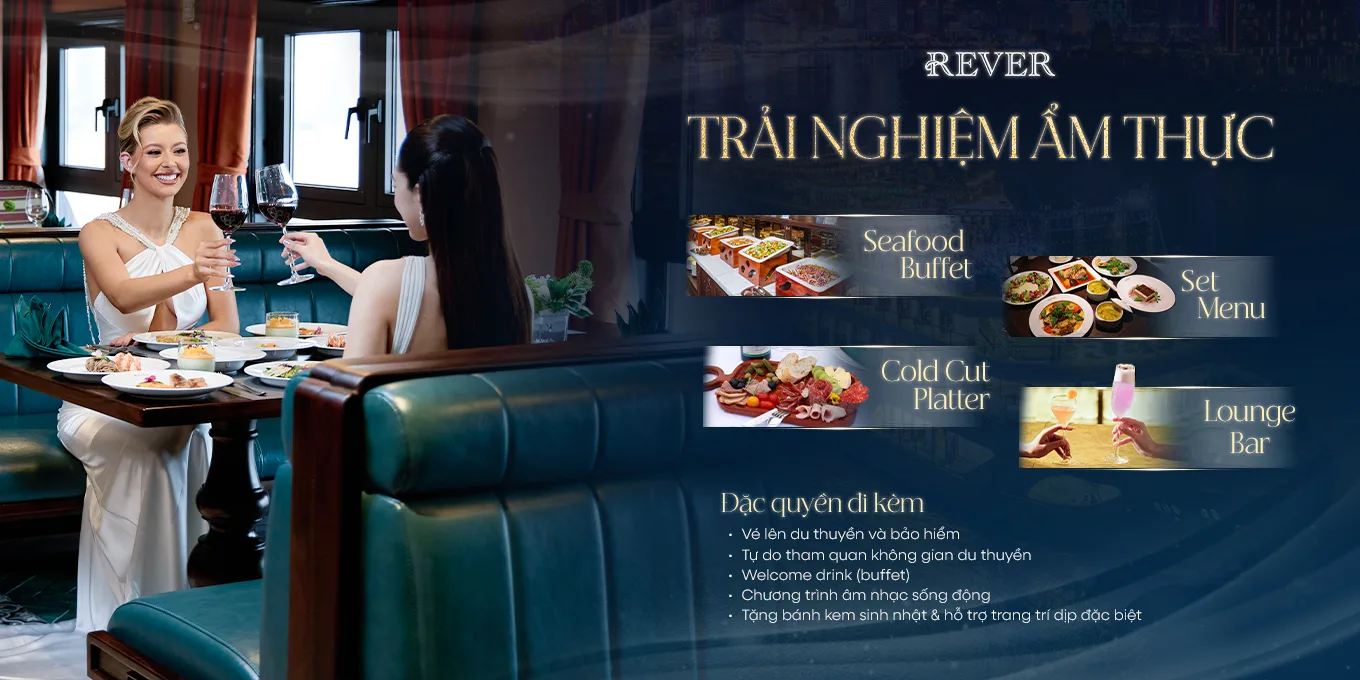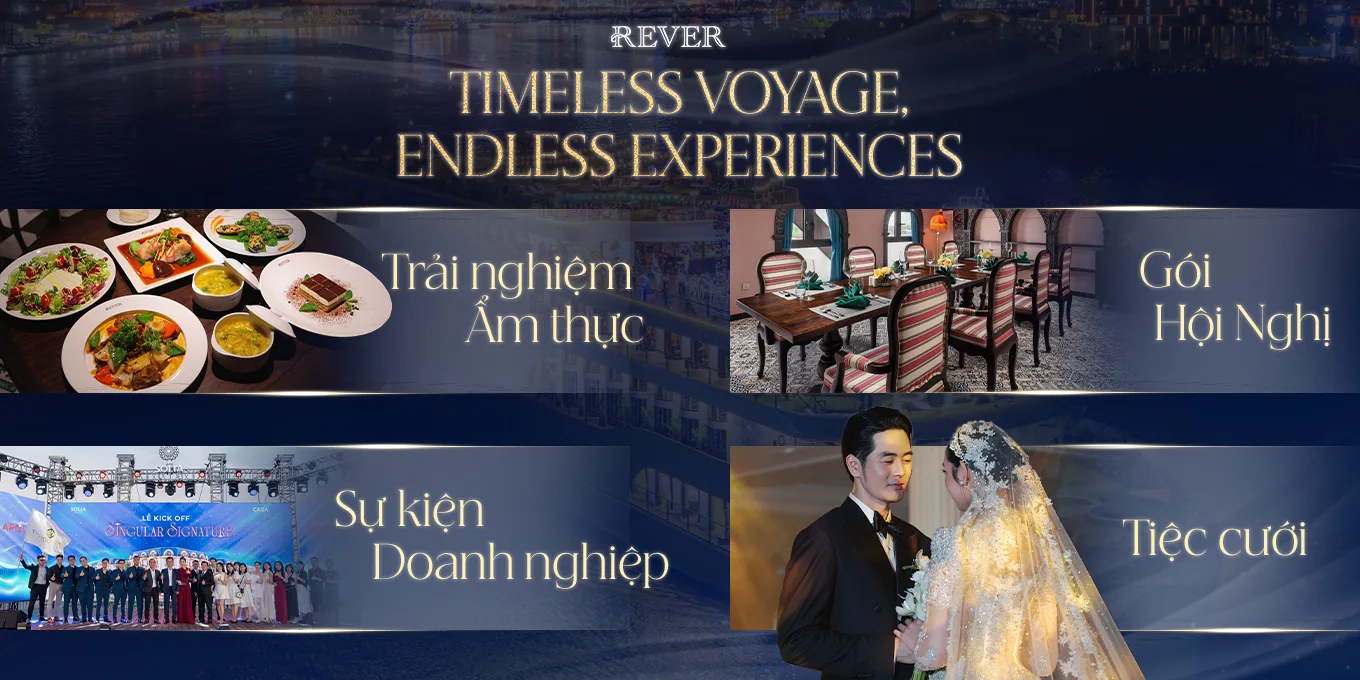 Với 10 không gian riêng biệt – từ nhà hàng, Sky Lounge, phong private đến khu vực hội nghị và sự kiện, mở ra chuỗi hành trình đầy cảm xúc. Tại REVER Cruise, mỗi khoảnh khắc đều độc đáo như dư vị của mỗi tác phẩm nghệ thuật. Dù là sinh nhật trên du thuyền, tiệc buffet trên du thuyền, các combo ăn tối theo chủ đề hay hành trình thực đắm chìm trong những dịp đặc biệt, REVER Cruise luôn mang đến những khoảnh khắc trọn vẹn và đáng nhớ.